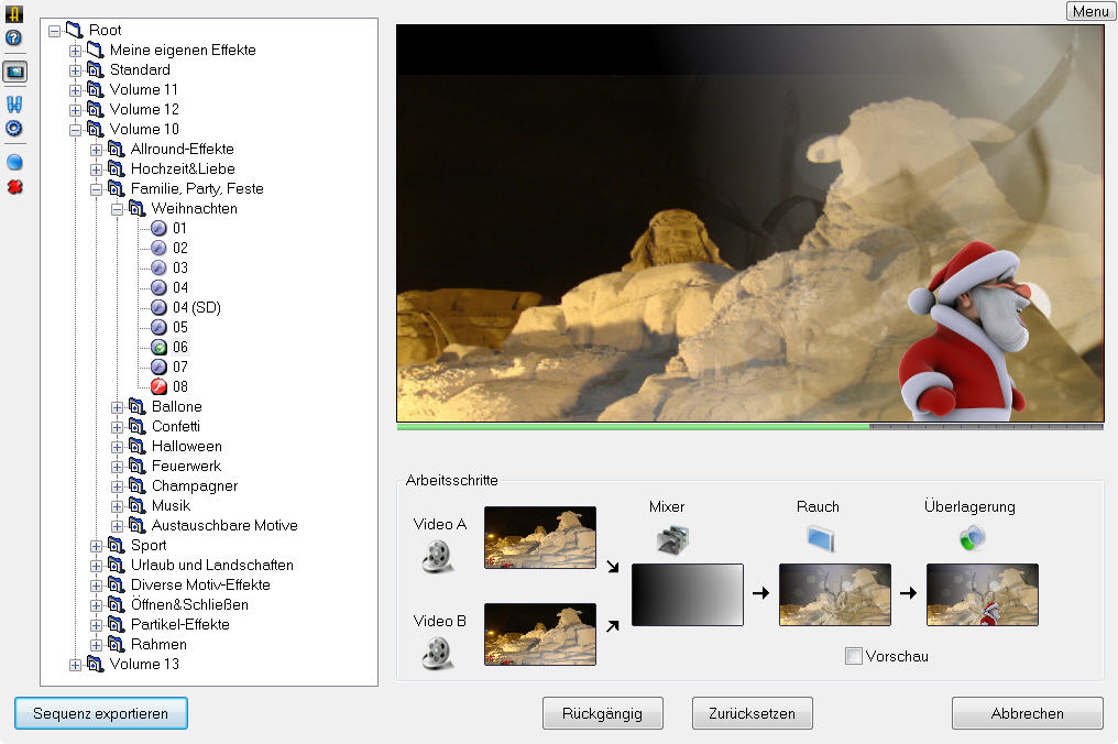 Also schnell Adorage als eigenständige Version gestartet, in der Effektliste das Adorage Volume 10 geöffnet und einen passenden Effekt aus dem Verzeichnis Familie, Party, Feste/Weihnachten ausgewählt.