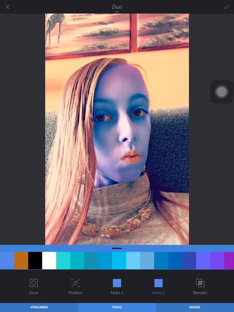 Wechseln Sie jetzt rechts in die Rubrik Filter und nutzen dann den Effekt DUO. Unten wählen Sie jetzt TOOLS und dann Position, um das Gesicht zu selektieren. Danach verändern Sie die Optionen Farbe 1 und 2 nach Blau. Im Moment ist das gesamte Foto Blau getönt, das ist jedoch nicht unser Ziel. Um das zu ändern, wählen Sie unten die Option Maske aus. Nutzen Sie jetzt die Option Löschen und danach wenden Sie die Option Auftragen an und wischen im gezoomten Zustand nur das Gesicht inkl. Hals (ohne Augen und Mund) blau, die neue Farbe (blau) wird aufgetragen. Bestätigen Sie diese neue Einstellung.