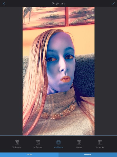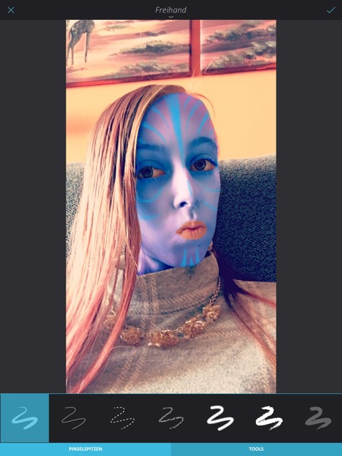 Wechseln Sie jetzt rechts in die Rubrik TOOLS und wählen die Option Umformen aus. Nutzen Sie hier die Option Verfeinern und zoomen in den Bereich der Augen, um diese anschliessend mit der Option Aufblasen mit den eigenen Fingern zu vergrössern, danach bestätigen Sie diese Einstellung. Wählen Sie rechts die Rubrik PINSEL und dort die Option FREIHAND aus. Positionieren Sie jetzt das Gesicht komplett bildschirmfüllend. Nutzen Sie die erste Pinsel-Vorlage und wechseln unten in TOOLS. Dort wählen Sie erneut die Farbe Blau aus. In den Pinsel Einstellungen nutzen Sie die Grösse 10 und Deckkraft 20. Jetzt malen Sie im Gesicht die Avatarkonturen und bestätigen danach die Einstellungen.