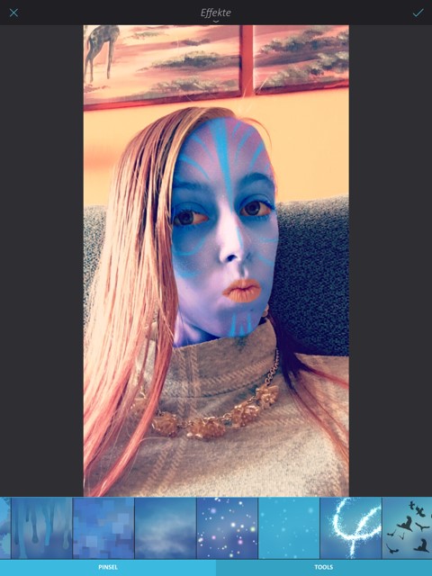 Wechseln Sie jetzt rechts in die Rubrik Effekte und wählen unten die Effekt-Vorlage Glitzersterne 14 (von links gezählt) aus. Danach nutzen Sie unten erneut die Option TOOLS. Dann ändern Sie in den Pinsel Einstellungen die Grösse auf 1 und die Deckkraft auf 35. Jetzt wischen Sie in den Bereichen des Gesichtes, wo die Glitzersterne erscheinen sollen (z.B. auf der Stirn) und bestätigen diese letzte Einstellung. Das Avatarfoto ist fertig, zum Schluss muss es nur noch exportiert werden, damit es in Ihrer Galerie zur Verfügung steht. Oder Sie laden es direkt auf verschiedene soziale Netzwerke hoch (wie z.B. Instagram, Facebook, Twitter etc.). Viel Spass beim Ausprobieren…!