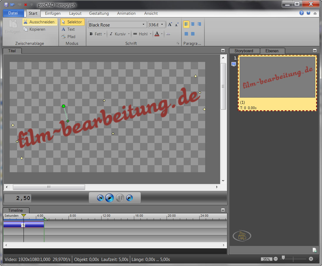 Allerdings aufgepaßt, diese Schreibschrift kann in Heroglyph V4 nicht als automatische Schreibschrift (sich selbstzeichnend) verwendet werden, dazu gelten weiterhin nur von proDAD integrierte Schreibschriften oder Ornamente.