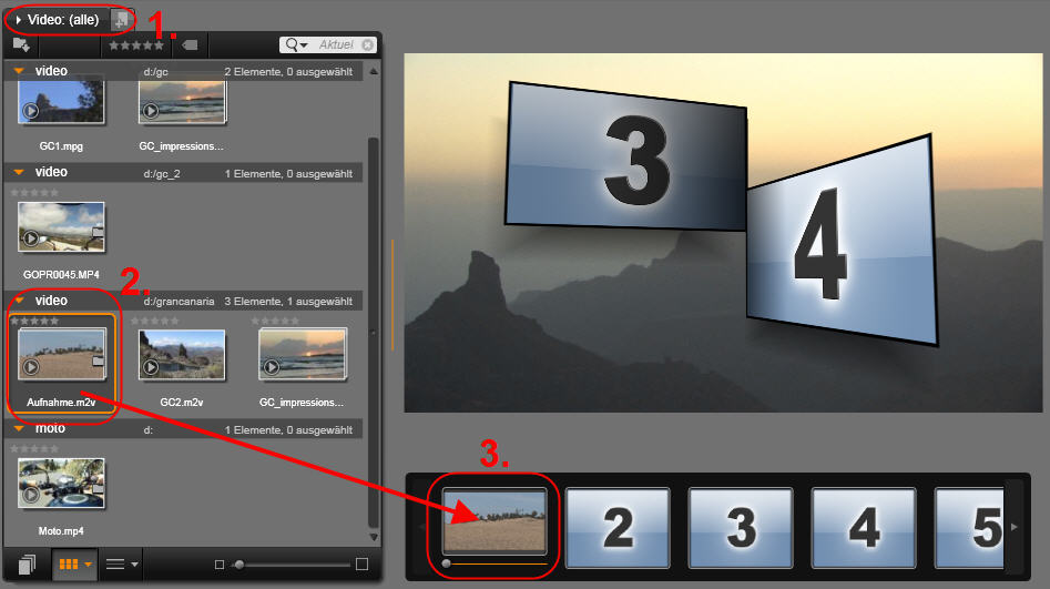 Wechseln Sie jetzt in das Register Video (1) und öffnen dann den Ordner Video (2) und ziehen mit gedrückter linker Maustaste einen Videoclip in die erste Kachel (3).