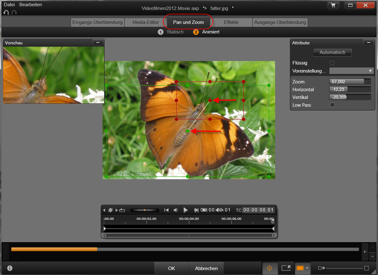 Aber man kann noch weitere Keyframes im Verlauf der Kamerafahrt einbauen und somit den Zoom und die Position im Bild weiter optimieren. Dazu klickt man einfach mit der Maus in die kleine Zeitleiste unterhalb der Vorschau. Ein weiterer weisser Punkt mit Rahmen wird im Verlauf der Kamerafahrt eingefügt. Nun kann wieder die Position und der Zoom für das neue Keyframe im Verlauf eingestellt werden. In der Zeitleiste erscheint dann das neue Keyframe. Jetzt kann man sich erneut das Playback unterhalb der Vorschau anzeigen lassen. In der kleinen Vorschau wird nun die neu erstellte Kamerafahrt angezeigt.
