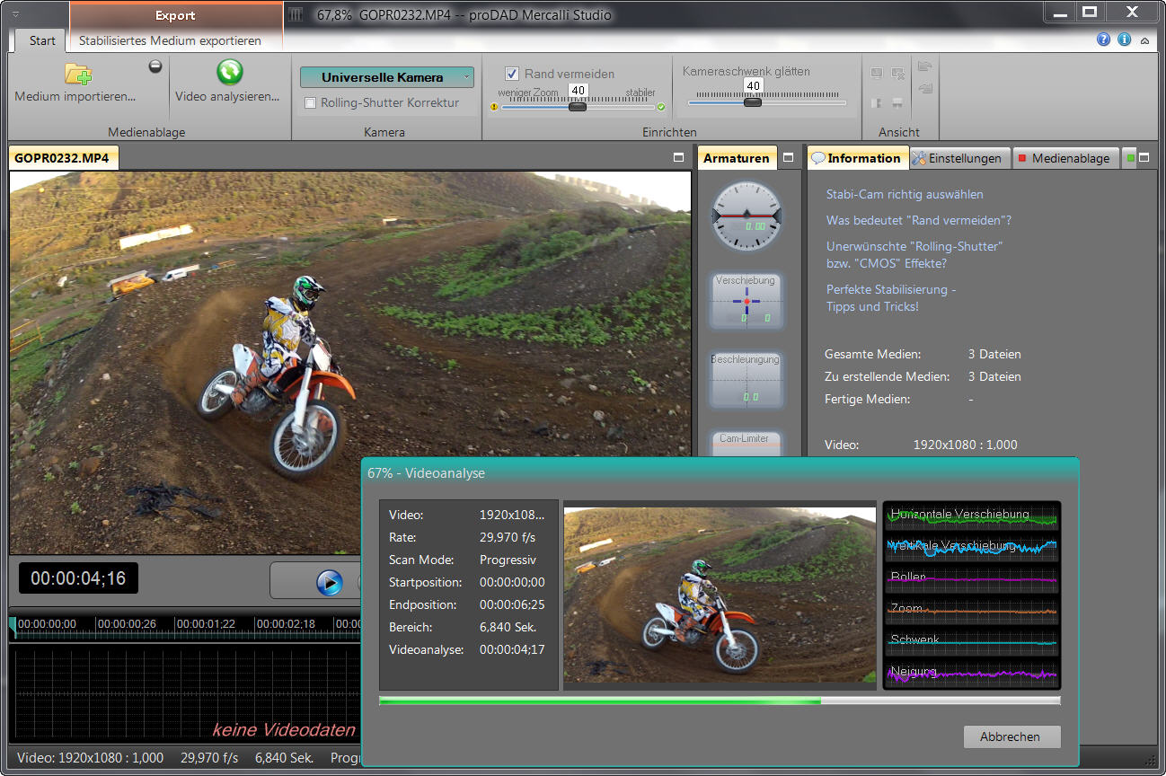 Es gelingt schnell und effizient Videomaterial in verschiedenen Formaten (SD, HD, 2,7k und 4k) zu importieren und zu stabilisieren. Der Import der Videos über die Import-Option oder via drag & drop direkt aus dem Arbeitsplatz in die Mercalli-Vorschau. Mercalli 3.0 erkennt das Video und ein einfacher Mausklick startet dessen Analyse. Mercalli 3.0 legt automatisch das richtige Profil zur Stabilisierung fest. Die Kamera (Profil) Universelle Kamera kompensiert ca. 80% möglicher Verwacklungserscheinungen. Wer also schnell zu einem guten Ergebnis kommen möchte, ist mit dieser Kamera-Einstellung gut beraten. Der Regler Kameraschwenk glätten gleicht Gesamtbewegungen im Video aus, man erreicht die größte visuelle Änderung/Glättung im Video. Mercalli 3.0 bietet auch weitere Detailoptionen an, die schon aus Version 2.0 bekannt sind. Die Arbeitsoberfläche von Mercalli 3.0 ist sehr gut überschaubar und strukturiert. Jeder findet schnell zum Ergebnis.
