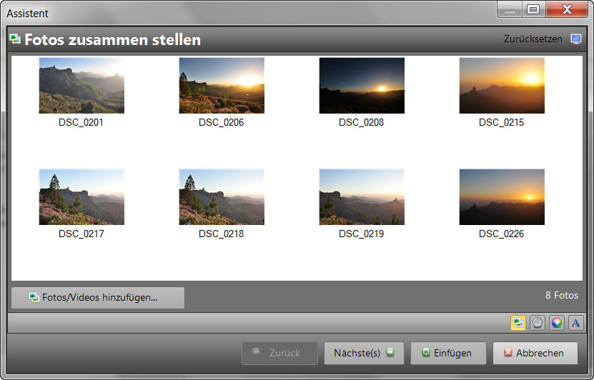 Starten Sie Heroglyph via Desktop-Ikon und wählen im Assistenten die Option Diashow aus. Es startet nun die Fotoauswahl. Sie können hier auch Videos einladen. Weiterhin besteht auch die Möglichkeit die Fotos direkt aus dem Arbeitsplatz via drag & drop in den Assitenten zu übernehmen.