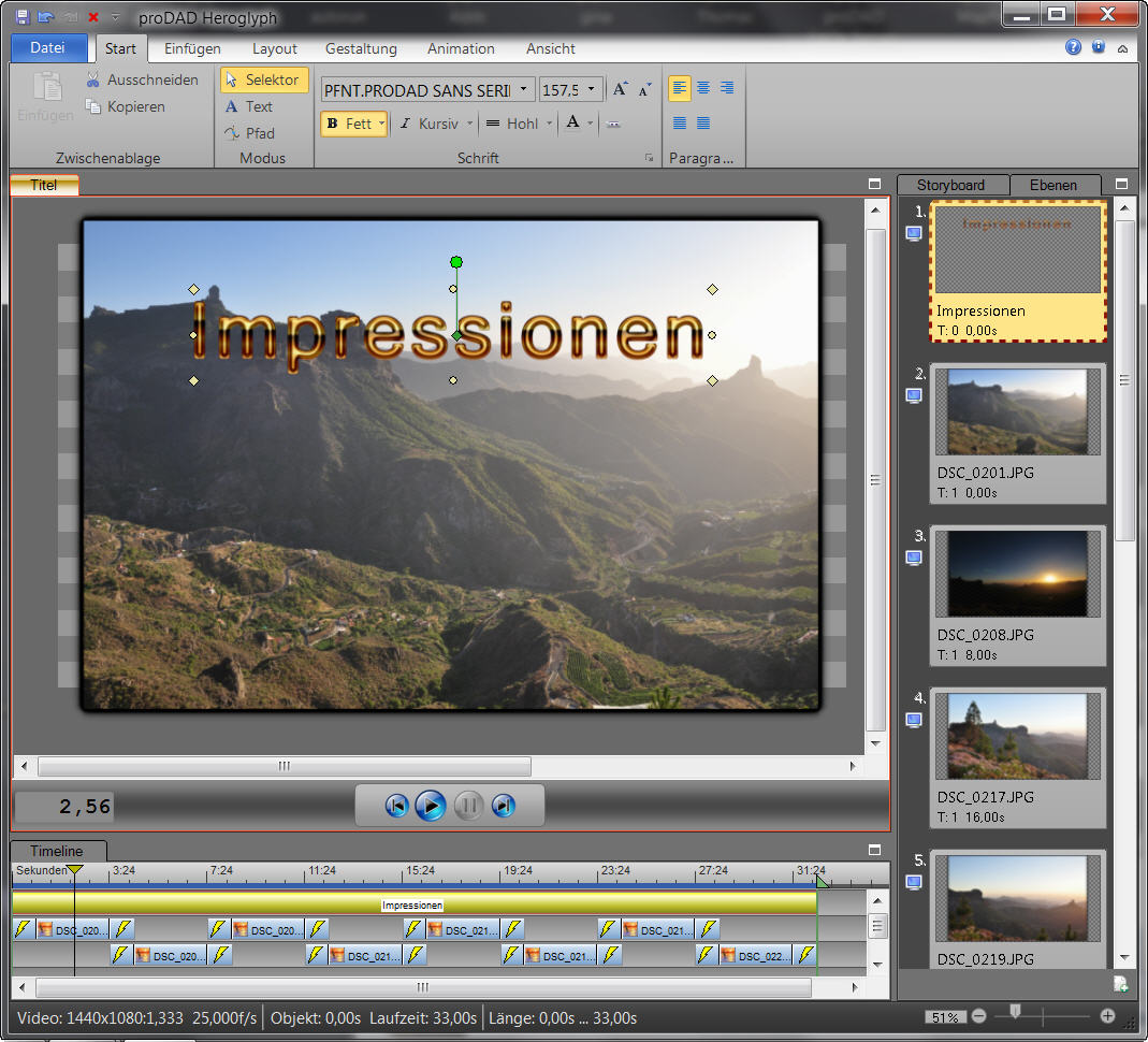 Hier wird die Diashow eingfügt und kann mit Play abgespielt werden. Mir fällt auf, dass die gewählte Schriftart des Textes noch nicht so optimal ist. Die kann ganz einfach geändert werden. Markieren Sie das obere Timelineobjekt (gelb hinterlegt) und wechseln in das Register Start. Jetzt wählen Sie eine andere Schriftart und Größe aus.